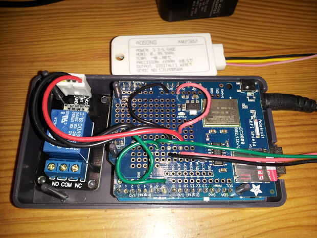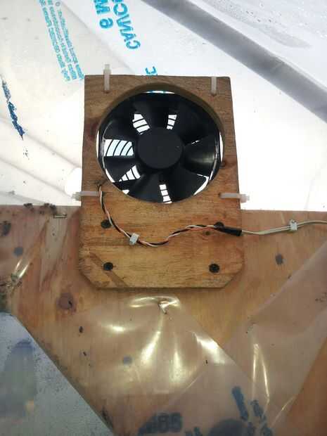 He instalado un ventilador de ordenador de 12V encima de la puerta y había enganchado a un arduino con un sensor de temperatura y humedad y un relé de 5V. Un escudo de wifi envía los datos por lo que puedo controlar las condiciones dentro del invernadero en el trabajo.
