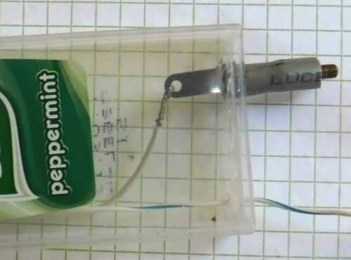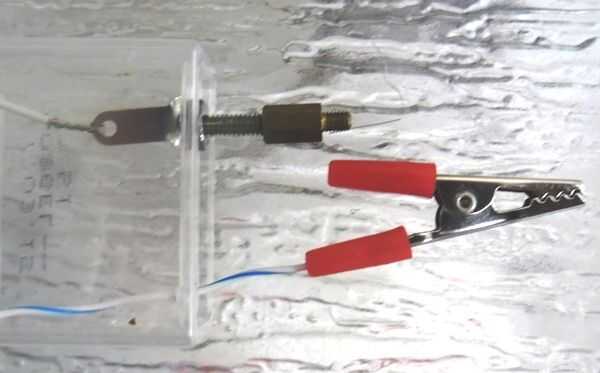 Conecte los dos cables de los 2 clips (rojo y negro) o a un clip (negro) y el fin de la cabeza del perno, utilizado como sonda. Asegúrese de dejar suficiente 'holgura' en cada uno de esos cables, para que pueda quitar la matriz Junta y batería el soporte necesario hacerlo (por ejemplo, así que usted puede cambiar la batería.) Completa la construcción de la Junta y otros componentes, así que ahora, suavemente Coloque el soporte de la placa y la batería al lado, dentro de la caja de Tic Tac e inserte la tapa blanca, el circuito interior de la caja de sellado.