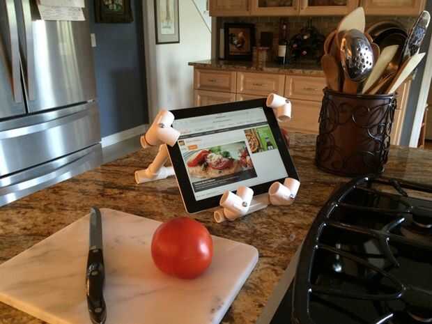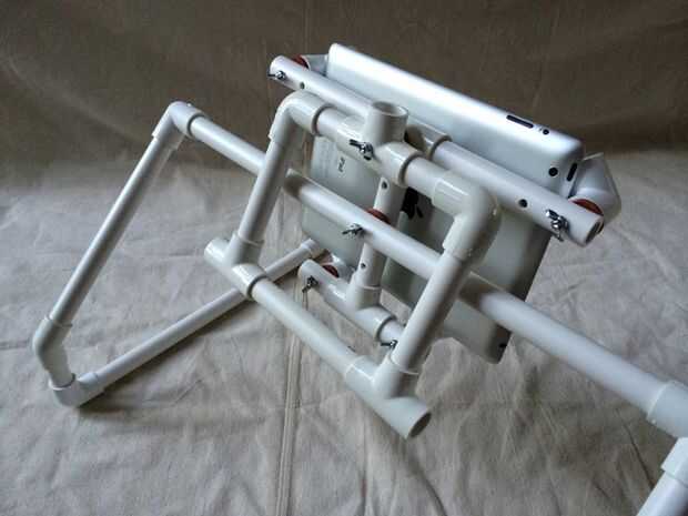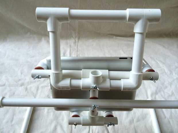 El pie de apoyo se utiliza para apoyar el dispositivo sobre una mesa, mesada, cama o incluso su regazo. Es fácil de hacer. Las longitudes notated en la foto de arriba son importantes para que el pie de apoyo no bloquee los orificios de la posición de retratos. El pie de apoyo gira simplemente alrededor de las articulaciones arrastradas de la t superior que está conectado por un tornillo de máquina de 2.5" a la t superior del bastidor (con una arandela de manguera entre las dos tes). Asegúrese de que la t superior es extremo abierto orientado como en la imagen para que no obstruya el tornillo debajo de él. La pata de apoyo puede girar hacia arriba y forman un asa que hace movimiento y colocación del stand mucho más fácil.