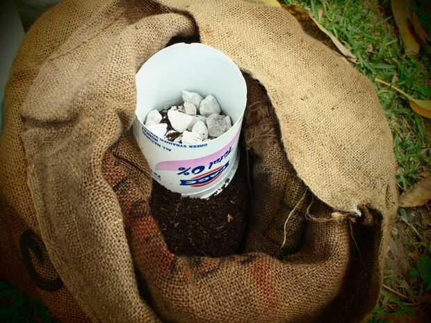 Tip: En retrospectiva, alambre de malla (alambre ckicken) o (quizás) un ancho tubo de PVC (u otro material que hace un cilindro) sería más fácil crear la columna central de grava. Forma el alambre en un cilindro largo, ponerlo vertical en la parte inferior de la bolsa, llenar con grava y llenar la bolsa con tierra alrededor de la cosa. Cuando haya terminado, podría dejar la malla de alambre dentro. Y si usted usa un tubo de PVC, tienes que sacar cuando la bolsa está llena de suciedad.
