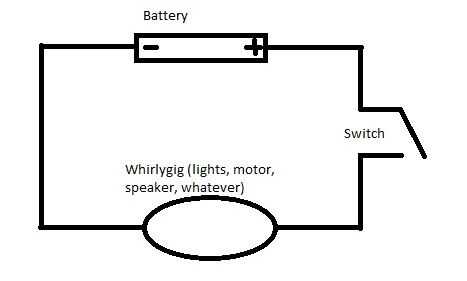 Lo que hace un interruptor es desconectar la batería de la whirlygig. Cuando el interruptor está "abierto", la batería se desconecta y no pasa nada. Al "cerrar" el interruptor, es como el interruptor no está aún allí, y el batter y whirlygig se reúnen una vez más. Puede hacer un simple interruptor tomando un determinado alambre en un dispositivo (uno que está conectado a la batería o whirlygig) y cortarlo. ¡ Pruébalo ya! * cuando el alambre de corte, el dispositivo deja de funcionar. Juntar los dos extremos del alambre hacia atrás y funciona otra vez. Es un interruptor!