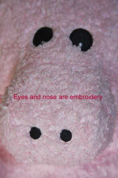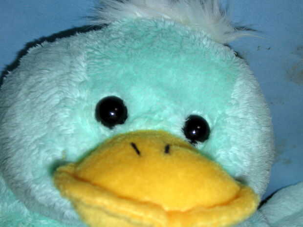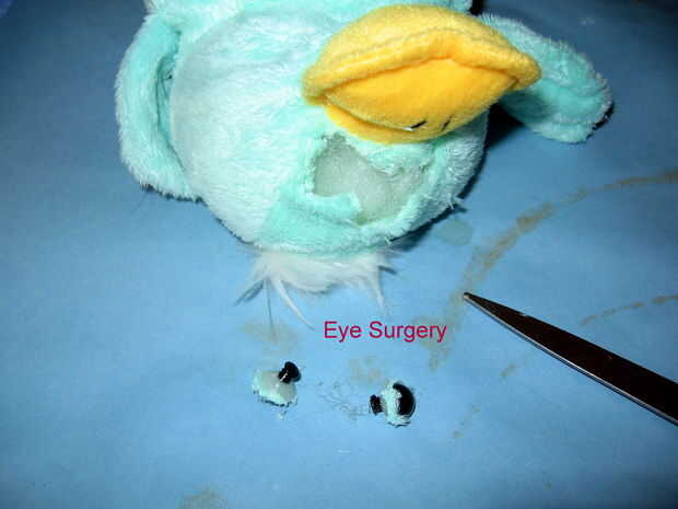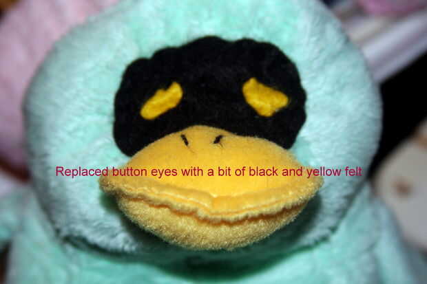 Al mismo tiempo en la tienda tengo otro juguete-esta un pato con un gran sonajero/chirrido. Éste, por desgracia tenía ojos de botón. Así que cortar los ojos y lo reemplazó con algo de tela. Costo.49 centavos, así que esto no era una gran inversión, y si lo arruiné algo aprenderá de mi inversión de tiempo de coser.