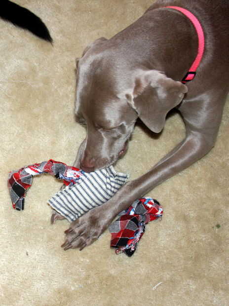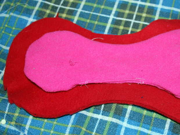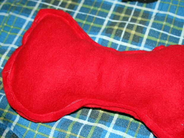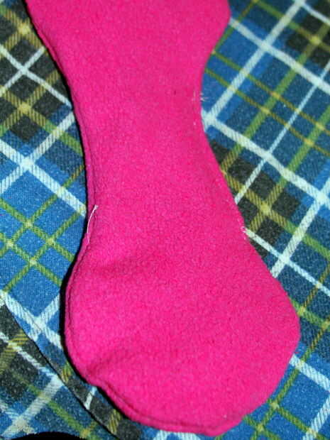 Cosí en la parte exterior de los tejidos en lugar de girar la forma de adentro hacia afuera (ocultando las costuras). Hice esto porque me he dado cuenta que cuando sus afilados dientes haceros con una costura, hacen un agujero que puede tirar y rasgar más grande. Además, los perros no se preocupan por la forma tanto como el ruido/squeak. La forma es más para el ser humano.