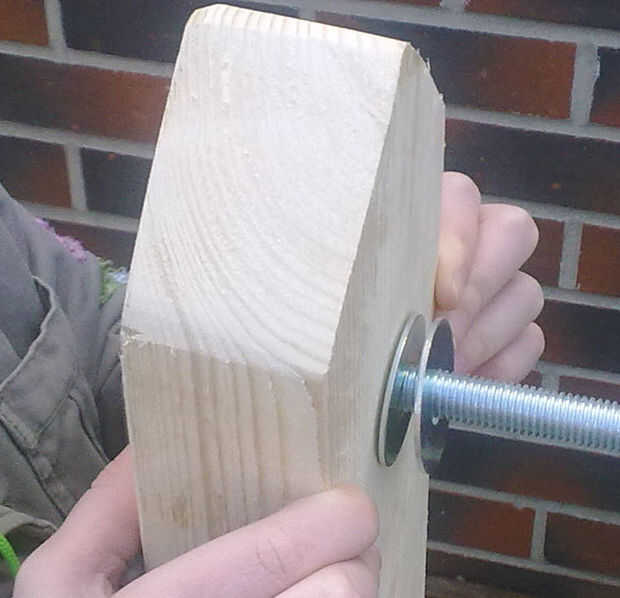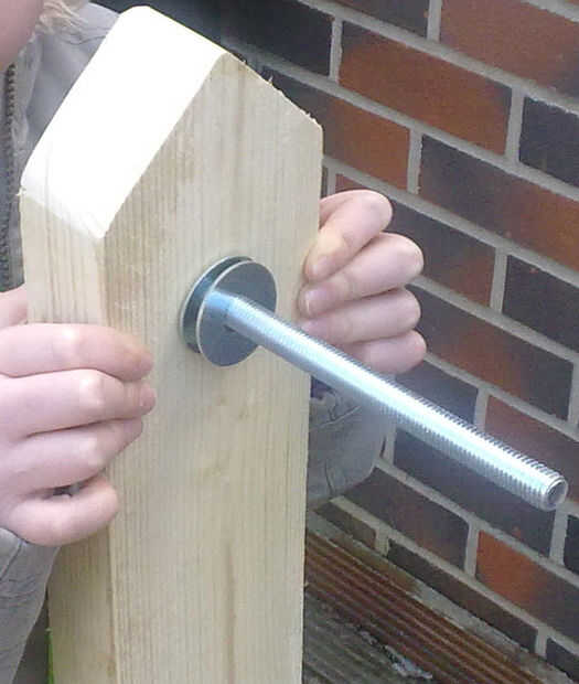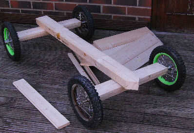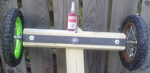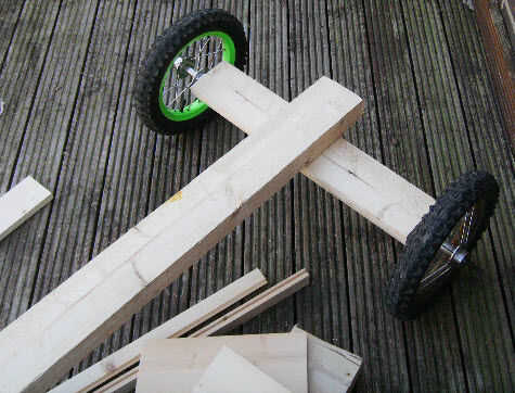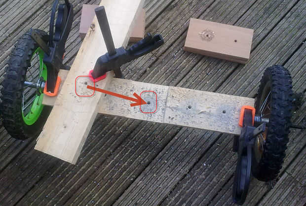 Sujetar el eje con las ruedas de bicicleta trasera para la primera viga de 55 cm y luego para fijar la viga 125 cm en su muesca - permita que sobre la caída en la parte trasera de aproximadamente 15 cm entonces taladro una serie de orificios a lo largo de su longitud a tak que el entrenador los pernos usada para sostener juntos.