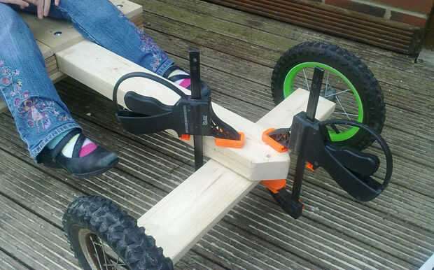 Para la dirección tenía uno de mi niños sentarse en el carro y mantenga sus brazos hacia fuera, luego funcionó una longitud de la cuerda de un ojo en el eje delantero a otro mientras que ella llevó a cabo en la misma. Después atado la cuerda de una longitud cómoda.