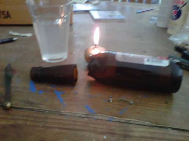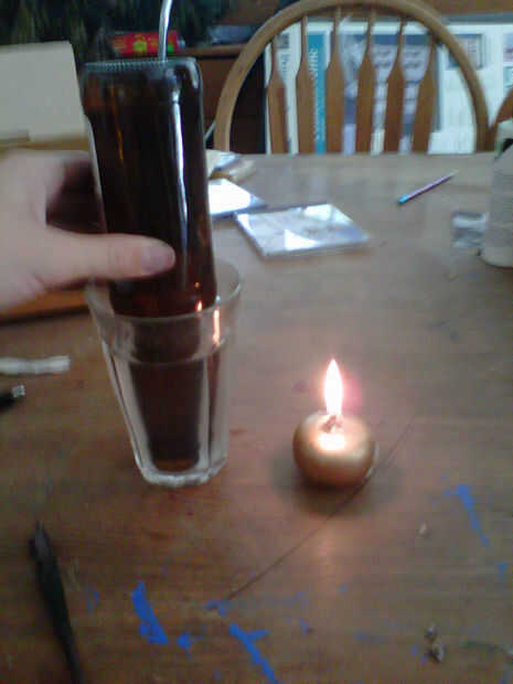 Para ello utilizamos una vela y un vaso tallish de gélida agua salado (no tienes que tener la sal pero hace más rápido). Básicamente vamos a calentar y enfriar la parte ranurada de la botella al mismo tiempo hasta que se rompe. Así que primero toma la botella y gire el cuello anotó por encima de la llama durante un minuto o entonces mojar el cuello de la botella primero en el agua haciendo que la parte calentada es cubierta. luego volver a hacerlo si no rompe al principio... Calor, Cool, Crack, repetir hasta rotura deseada. \