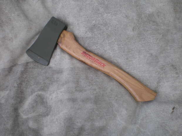 La pala de la foto es aproximadamente de 24" de largo. El hacha tiene una cabeza forjada. También tiene un cordón de silicona sobre la hoja, para disminuir el riesgo de conseguir corte. No interfiere con el corte - una chuleta y se ha ido.
