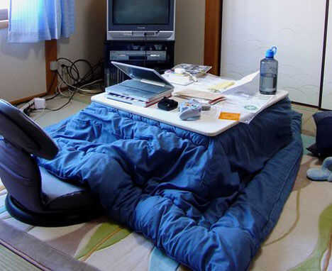 según wikipedia, "un kotatsu, usado casi exclusivamente en Japón, es un marco de mesa baja de madera cubierto por un futón o manta gruesa, sobre el cual se encuentra una mesa. Por debajo es una fuente de calor, a menudo incorporada en la propia mesa.