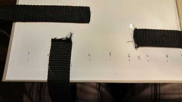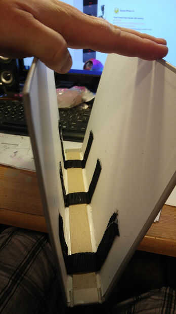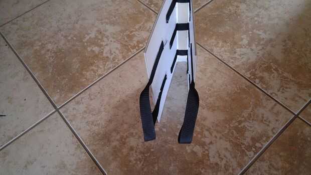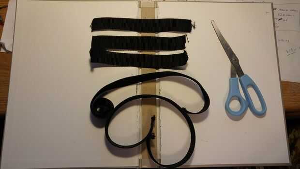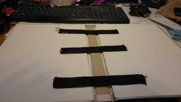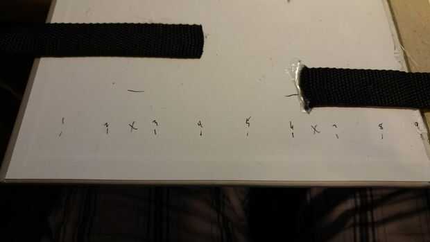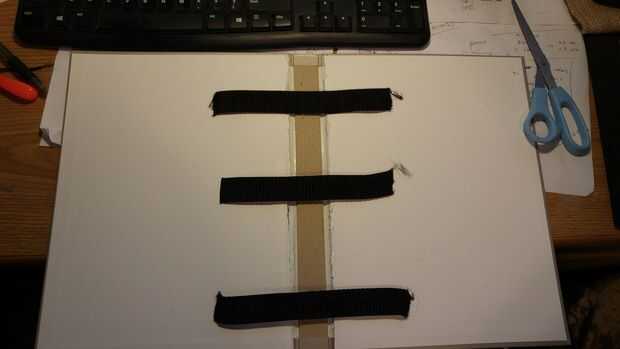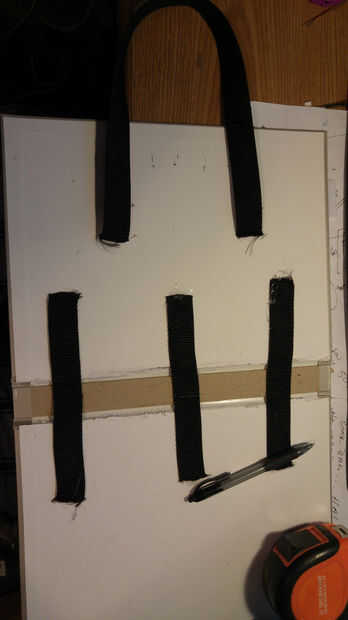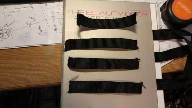 Ahora es el momento para llevar las correas de nylon y hacer nuestro apoyo y manijas. No confío en el enlace de un libro para sostener juntos así que corta la primera tira de nylon en 3 soportes y 2 asas. Mis mangos eran aproximadamente 19 pulgadas y las correas de apoyo fueron divididas en 3 partes iguales de la correa restante. A continuación nos caliente pegamento 3 apoyo las correas sobre la encuadernación, de libros que fueron colocadas al azar sin medidas. Los tiradores se colocaron 3 pulgadas de cada uno (esto puede también hacerse al azar si no quieres medir, pero quería mina a ser exactamente igual en ambos lados así que medí.) del borde exterior A continuación cortaremos la correa 2 º en 4 partes iguales, mina corté en tiras de 7 pulgadas. Estos cuatro estará en el borde exterior del libro para ayudar a mantener los objetos dentro de la bolsa. He medido y había marcado mis cintas de dos pulgadas desde la parte superior y dos pulgadas de. Las dos correas inferiores se midieron en 6 pulgadas hacia abajo y dos pulgadas hacia abajo, esto obviamente depende de su tamaño de libro y debe ajustarse en consecuencia. Luego caliente la cola a un lado de la correa hasta el libro, pero asegúrese de que tener las medidas ya marcadas para los otros lados.