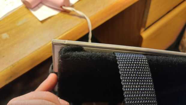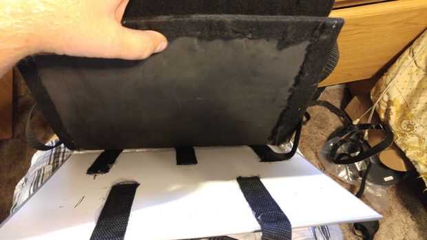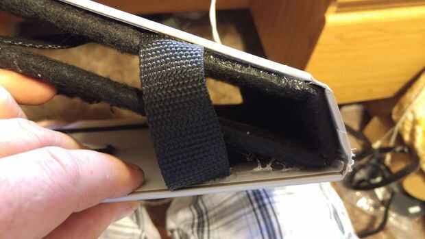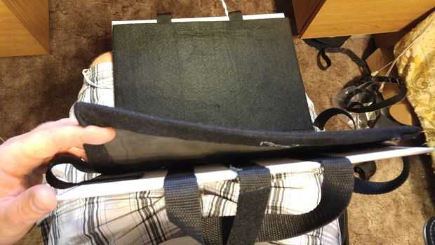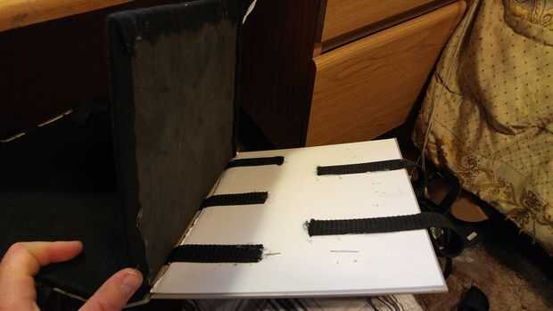 Ahora necesitamos caliente pegamento la espuma al libro. Esta es la parte más delicada. Puse una buena cantidad de pegamento caliente en el atascamiento de libro y primero ha añadido ese pedazo de la espuma. Fui alrededor de una pulgada a la vez agregar pegamento y luego manteniendo la espuma, pelar encima de un poco y agregar el pegamento más. Sugiero para pegar la espuma hacia el lado que ya tiene las correas laterales pegadas abajo primero. La parte más difícil es que las correas laterales tendrán que ser pegado en lugar antes de pegar la espuma hacia abajo. Así que después todo pegado podemos volver, compruebe nuestros bordes y añadir cualquier pegamento si los bordes están subiendo en todo.