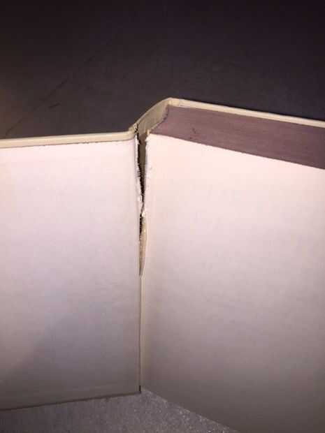 Para empezar, me pareció más fácil colocar el libro vertical con uno de la cubiertas ligeramente abierta entonces para cortar el interior de la costura donde une al libro. Recuerde cortar hacia abajo y hacia delante.