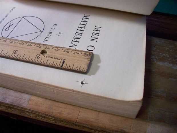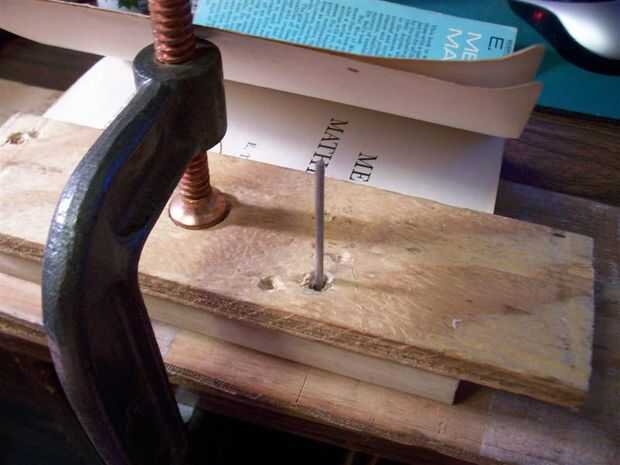 Para un libro de 1 lb 5 oz, como en este ejemplo, un agujero relativamente pequeño se requiere dependiendo del material utilizado para el pin. Si se utiliza una aguja de acero inoxidable por ejemplo todo lo que se necesita es un orificio muy pequeño, no mucho más grande que puede hacer un ratón de biblioteca. (No es la clase de bookworm que Lee libros pero el tipo que come ellos.).