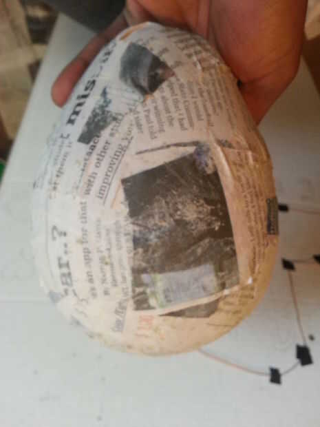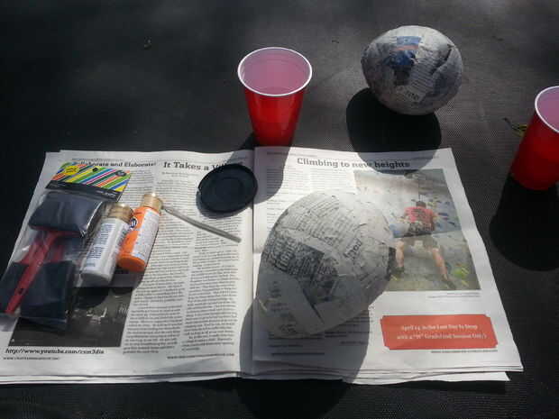 ¡ Prepárese a ensuciarse las manos! Se iniciará la construcción del sol y el planeta LittleBit48. En esta sección usted tendrá periódico, globos, tijeras, harina, agua, un recipiente, utensilio, pintura acrílica, pincel, pipecleaners y un fan(drying) de mezcla. Comience por cortar 2" tiras de periódico para cubrir el balón. Crear una pasta de papel maché mezclando dos partes de harina/pegamento y una parte de agua en un tazón. Infle dos globos. Sumerja una tira de periódico en la mezcla de papel maché y cubrir el balón con una sola capa. Retire cualquier exceso de pasta el globo para acelerar el proceso de secado. Pegar los globos delante de un ventilador y esperar hasta que se seque. Una vez se ha secado, repita el proceso. Después de la segunda capa se haya secado, utilice una chincheta para hacer estallar el globo en el interior de la cáscara de papel maché.