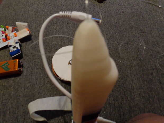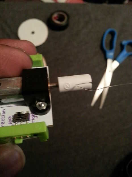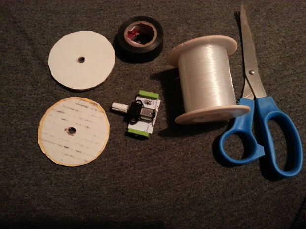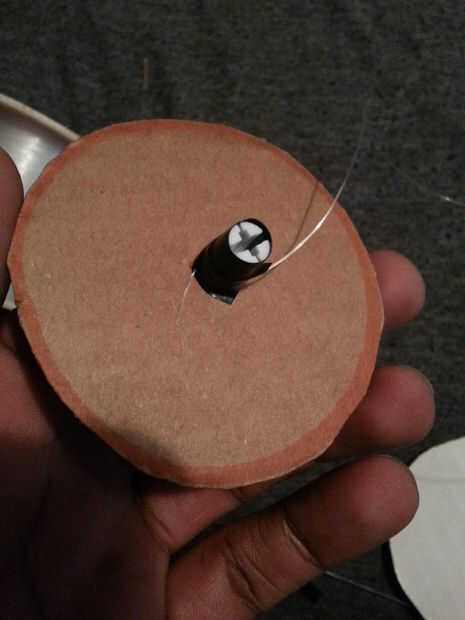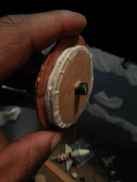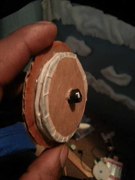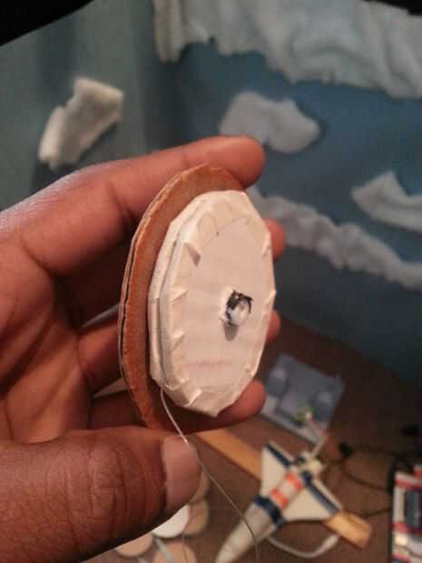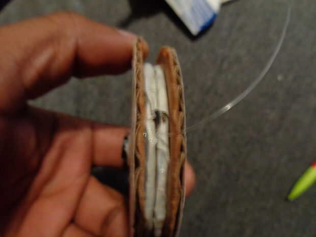Ahora vamos a diseñar el sistema de la polea. Usted necesitará dos cilindros para crear círculos en una hoja de cartón para la construcción de dos ruedas. Usé una lata de soda y botón. Rastrear el fondo de la lata de soda en la cartulina y crear 4 círculos. Encontrar un cilindro ligeramente más grande o más pequeños para crear cuatro círculos más. Los círculos de diámetro más pequeños son el interior de la polea, mientras que los círculos más grandes como el soporte de la polea. Con un lápiz, haga un orificio a través del centro de cada círculo (esto es para el compañero de motor). Corte 4 pies de sedal y envolver un extremo a su propio compañero de motor. Asegurar la línea alrededor del mate motor con cinta aislante. Sándwich de los dos pequeños círculos juntos a lo largo de la costura con cinta de enmascarar con el compañero de motor en el centro. Dejar medio centímetro de espacio entre los dos círculos para que la cinta puede formar un bosque así que el sedal se puede envolver alrededor de la polea; mantener un pequeño agujero en la cinta para que la línea de pesca podría envolver alrededor de la polea. Como prueba, enrolle el sedal alrededor de la rueda para asegurarse de que la profundidad de la arboleda es lo suficientemente profunda. Ahora, pega los dos círculos más grandes en el exterior de los círculos más pequeños. Ahora han hecho la primera rueda. Antes de crear la segunda rueda, vaya al paso 21.
