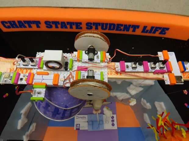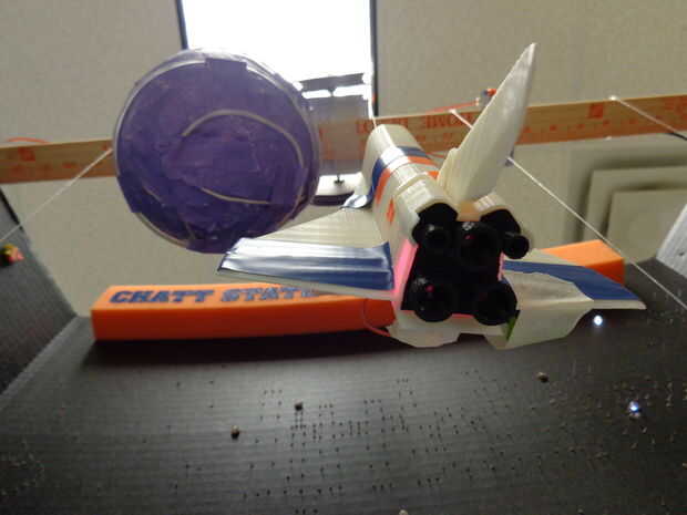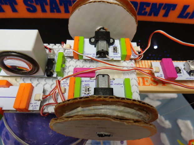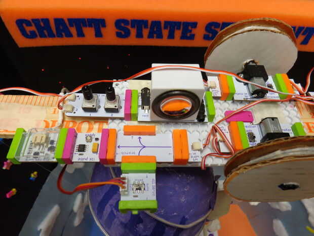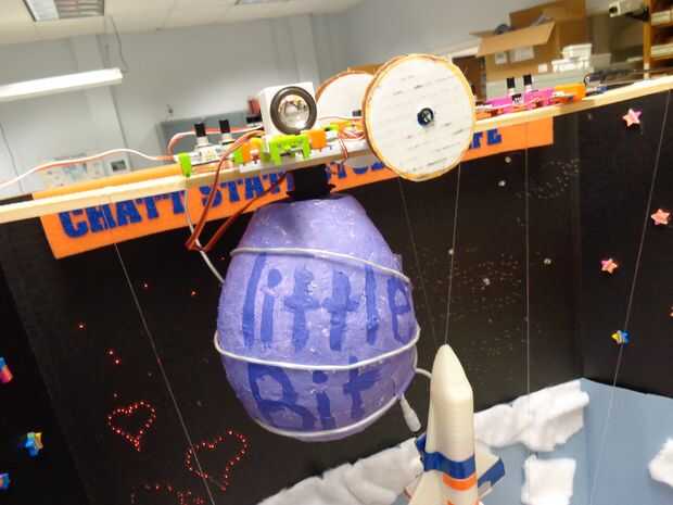 Puesto que el sistema de la polea es completado, podemos construir la parte superior del universo. Se necesita el primer circuito dentro de este proyecto. Cinta de la Junta de montaje al centro del yarda del palillo. Pone el criterio en la parte superior de la Junta. Coloque el launchpad y servicio de transporte en el suelo directamente bajo el criterio. Coloque las ruedas en los motores de DC. Cambiar un Motor de DC a la dirección izquierda y el otro a la dirección correcta; Esto le da elevación a la lanzadera. Pruebe el sistema de polea. Enrolle el sedal alrededor de una polea para que la línea es uniforme en ambos lados. Una vez que el transbordador casi ha alcanzado la cima, detenerla y montar los servos en la parte inferior del criterio con el adhesivo caliente unas pocas pulgadas de la lanzadera. Esto gira el planeta y hacia atrás. Ahora pegue el planeta en el servo. Impresionante instalación!