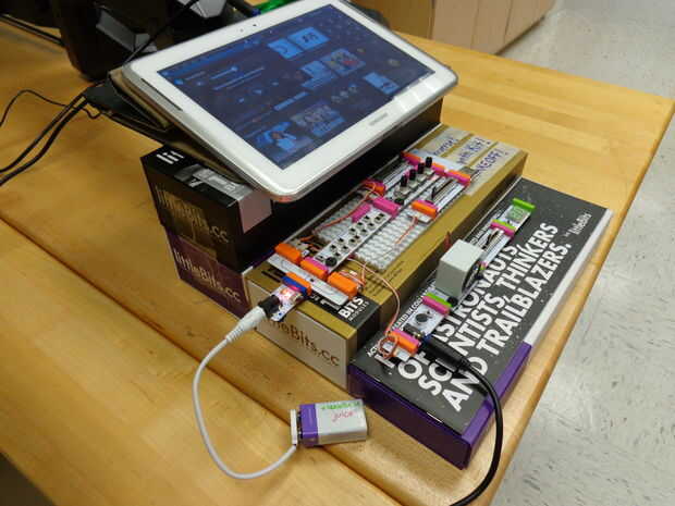 Energía para arriba! Usted puede controlar su universo de 100 pies de distancia y puede jugar en cualquier cosa desde tu tablet! Con un rotulador, etiqueta cada canal en las tiras de cinta al lado del transmisor. Usar un tablet o un control remoto para activar un emisor de infrarrojos. ¡ Prepárate para despegar! Cuando es el momento de "Despegue" a una aventura con su littleBits, utilizar la sede como una caja de poco!