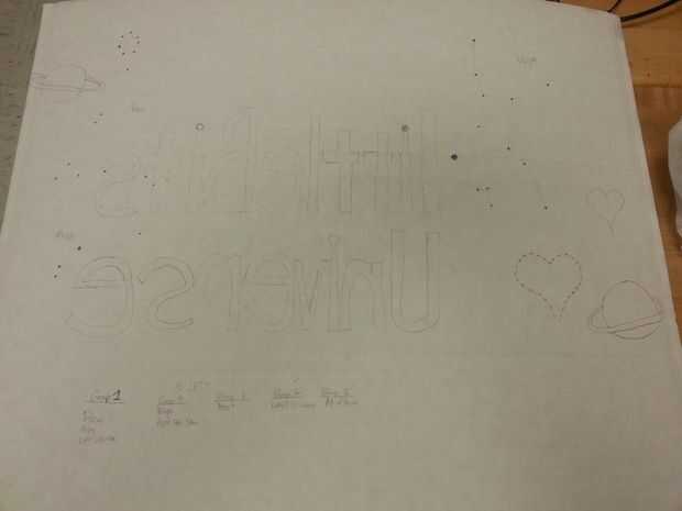 En la parte trasera de la sección media, se iniciará el trazado de la. En primer lugar, dibujar en la parte trasera de la Junta lo que quiere parecerse a través de la parte delantera de él. Dibujamos estrellas constelaciones (Piscis, Aries, Virgo, Leo, planetas, corazones y "littleBits universo"). Ser consciente de las imágenes del espejo ya que se muestran a través de la parte frontal del tablero. Imprimir una hoja de constelaciones de estrellas y voltear la hoja. Coloque la hoja sobre una luz (linterna o tablet) y localizar las diferentes constelaciones que gustaría tener con un lápiz en el tablero.