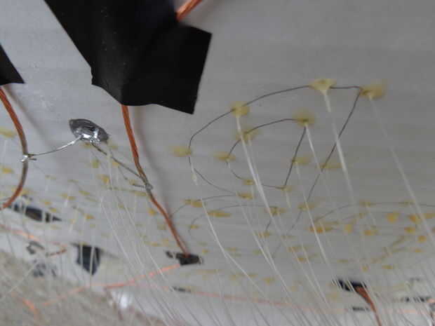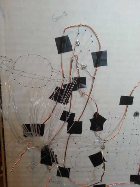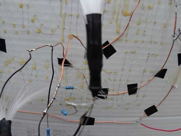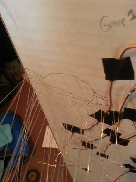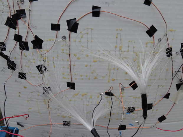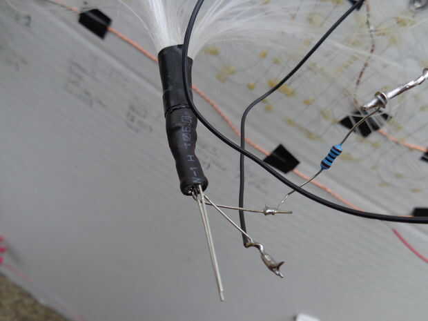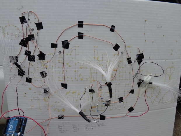 Este paso puede ser más tedioso. Ahora crearemos las lámparas mini fibra óptica. He utilizado las fibras de una lámpara de fibra óptica que encontré en línea. Cortar cuatro 2 pulgadas piezas de calor retráctil para cubrir alrededor de los cuatro LEDs. Utilice la pistola de calor para reducir el calor se contrae alrededor de los plomos de los ánodos y cátodos. Se pegan como muchas fibras a través de la apertura de los encogimientos del calor como sea posible. Una vez que se llenan, el calor se contrae para proteger las fibras. Ahora es el momento para alimentar las fibras a través de los agujeros. Asegúrese de colocar las fibras de cada LED en el grupo correcto. Si las fibras se convierten en doblado, sólo recorte hacia abajo. Deje unos 2-3cm de fibra a través al otro lado de la Junta. Use pegamento para madera para sujetar las fibras (cualquier otro pegamento solvente distorsione la luz en las fibras). Colocar estratégicamente las lámparas mini fibra óptica donde las fibras pueden llegar a todos los agujeros. Recuerda, paciencia paciencia paciencia!!!! Es bien vale la pena!