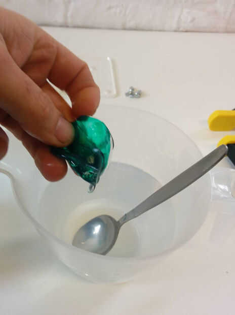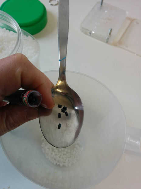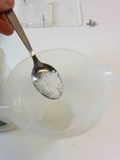 Mientras que ocurre he medido hacia fuera 1/2 cucharada de gránulos de polimorfia blanco y poner en una jarra medidora. Esto dependerá del tamaño de tu molde.