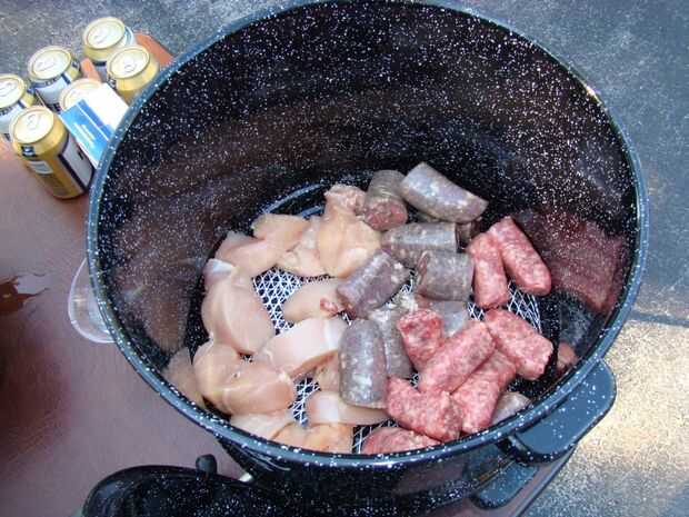 Primero los trozos grandes de las pantallas vegetales fueron arraigned en la parte inferior de la vaporera para mantener los agujeros de drenaje de vapor abierta. Luego coloqué todas las carnes en la parte inferior de la vaporera.