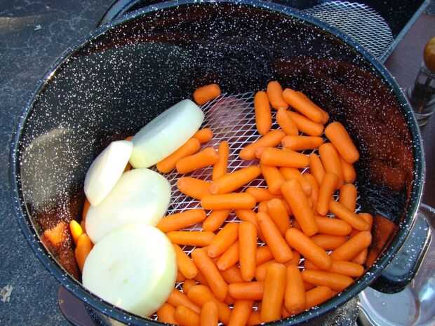 Otra pantalla se colocó encima de las patatas y las cebollas y las zanahorias fueron agregadas.
