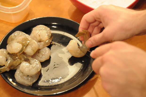 Antes de comenzar a mojar su camarón, usted necesita cortar en el lado del vientre para enderezar.