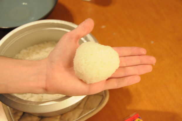 Una vez el arroz está hecho y se haya enfriado un poco, Mójese las manos con agua y sal (para que el arroz no se peguen las manos) luego tomar el arroz y formar una bola o forma triangular pequeña