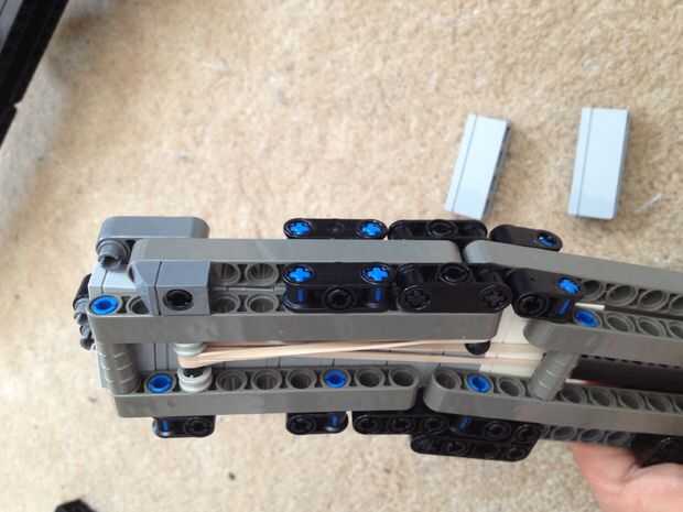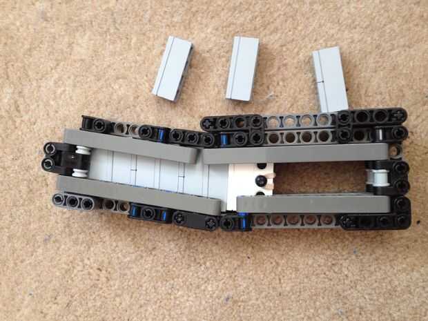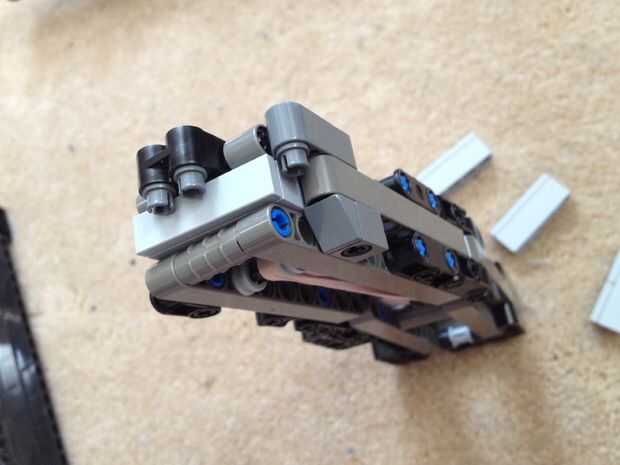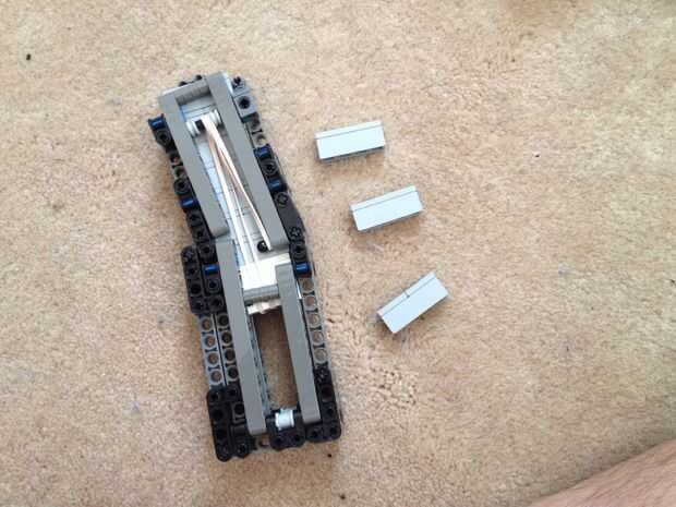 Tiene 10 ladrillos de 1 x 4. La pieza blanca en las fotos se empuja hasta la munición gris. La munición que utilizo aquí tiene una placa plana pero eso no es realmente necesario. Si no lo usas, tienes que alternar boca abajo, derecha-arriba y así sucesivamente.