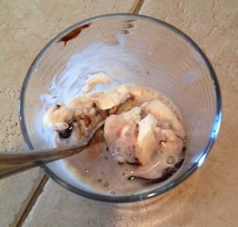 Usar el lado de la cuchara para empezar a cortar los ingredientes juntos. Mucho depende de cómo el frío y duro es el helado. No caliente el helado, pero sacó directamente de la sección de congelador de nuestro frigorífico/congelador de la cocina.
