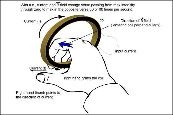 Una corriente directa, de baterías, genera un campo magnético constante. La dirección del campo magnético con respecto a la corriente se establece convencionalmente por la regla de la mano derecha llamado: referente a la imagen, agarrar la bobina con la mano derecha con el pulgar apuntando en la misma dirección de la corriente, el campo magnético tendrá la dirección de los otros cuatro dedos.