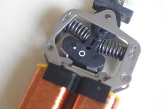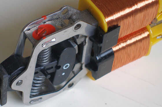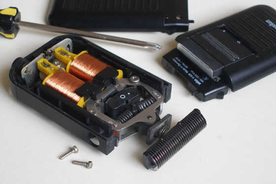 En las fotos puede ver la estructura de una hoja de afeitar: dos bobinas generan un campo magnético alterno. Entre sus expansiones polares (el metálico en forma de U núcleo dentro de las dos bobinas) se coloca un imán con el resorte. La CA genera un campo magnético alterno que a su vez las fuerzas del imán a oscilar y girar las cuchillas de la maquinilla de afeitar.