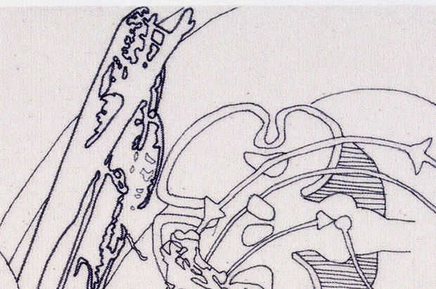 Aquí está un detalle de la obra de 1993 que muestra un poco mejor la naturaleza material de la misma. Esta obra en particular es una 'pintura' simplemente porque se hace sobre una superficie que pasa a ser un lienzo. La línea es de tatuados en el lienzo – fue dibujado usando algo como una pluma Sharpie punto fino, que era todo un reto debido a la textura de la tela, por eso usé el tatuaje de la palabra.