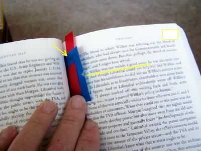Mueva el cursor hasta la línea donde desea comenzar de nuevo. Ver el subrayado en amarillo. (He metido en el hábito de alinear la parte inferior de la página con el fin de la pieza larga del marcador y dejando que cualquier sobrante a sobresalir de la parte superior de la página. Si el marcador se mueve hacia arriba o hacia abajo en el libro, sólo tire de la parte inferior del marcador en la parte inferior de la página y el indicador de línea está de vuelta donde había colocado.)