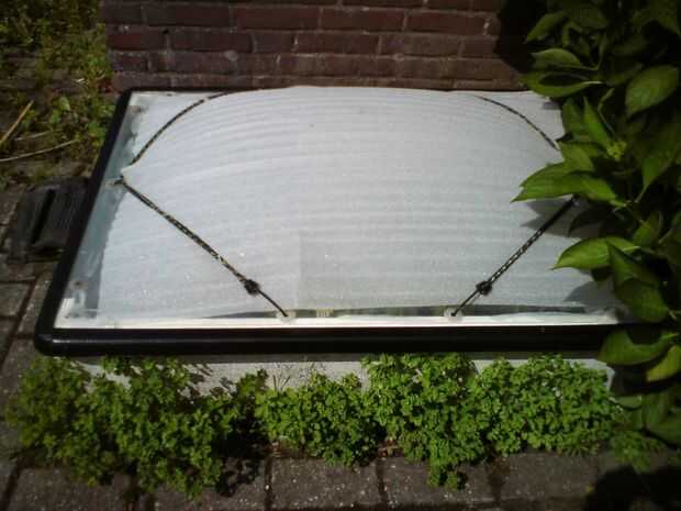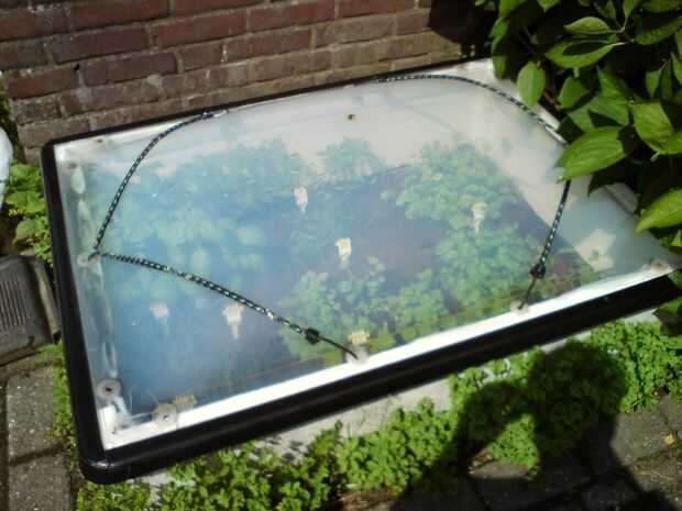 Con el tiempo, mi cúpula tragaluz adquirió una frontera de ductape negro, que se ve aseada y esconde algunas grietas; También he añadido algunas relaciones de equipaje así que puedo cubrir la cúpula con algo translúcida para proteger mis hierbas de sol muy brillante.