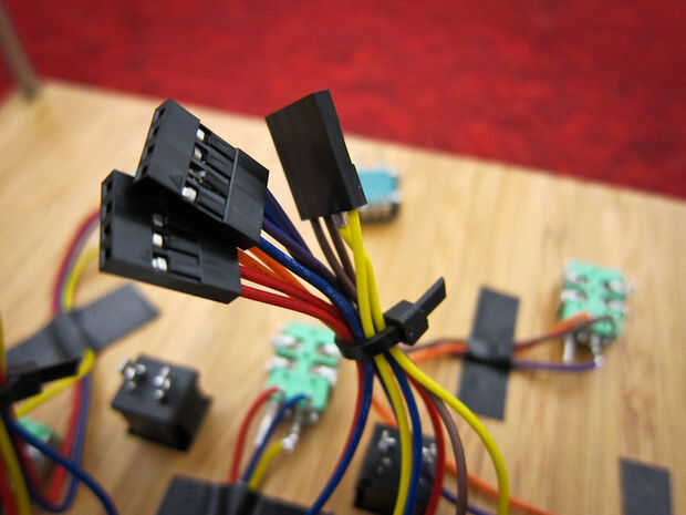 Ahora es importante que conectar todas las conexiones de la lectura de potencia de planta en diferentes soportes. Tenga en cuenta la orientación de los pines de cabezal de lectura de tierra de potencia en el PCB. Si usted entiende el paso 4 debe ser evidente cómo las carcasas de presión deben ser creado y conectado. Con ataduras de cremallera o cinta para cables de grupo para ciertos tipos de componentes es muy recomendable (ver imagen).