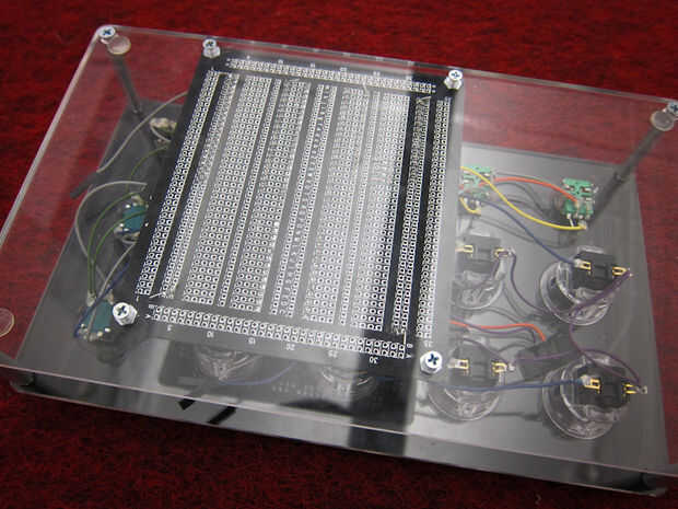 Primero fije su PCB para la capa de fondo con algún hardware. Tenga en cuenta que no incluí en el PCB de montaje agujeros en mi causa de archivos de corte láser que sabía que quiero especificar la posición de la PCB en adelante.