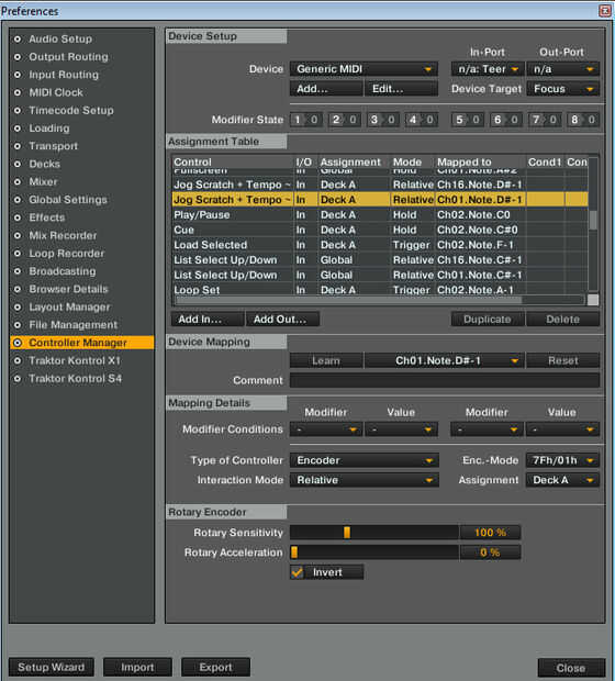 He adjuntado mi archivo de mapeo para Traktor II Pro. Este archivo sólo funciona para mi dispositivo pero se puede cargar en Traktor y tener una idea de cómo asignan mi codificadores, potenciómetros y botones. Traktor ha incluido muchas características asombrosas que hacen asignación personalizada que una brisa - mi sombrero va al brillante equipo de Native Instruments.