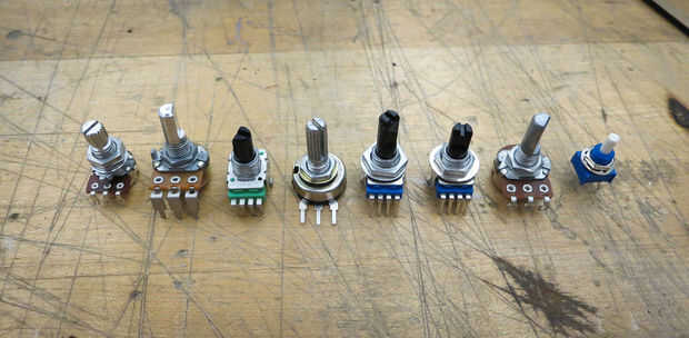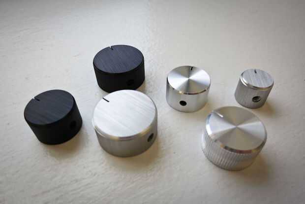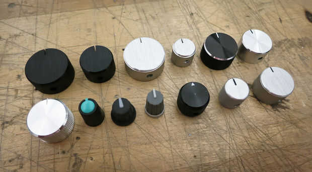 (Las perillas moleteadas pueden fijarse sólo para ejes estriados. Perillas con tornillos de fijación requiere una llave hexagonal para acoplar con el potenciómetro. perillas de 6,4 mm juntadas con los ejes de 6mm ajuste ligeramente no concéntricos - esto se puede solucionar con un poco de cinta scotch. potenciómetros de mm 6,35 existen aunque no he podido encontrar una opción económica.)