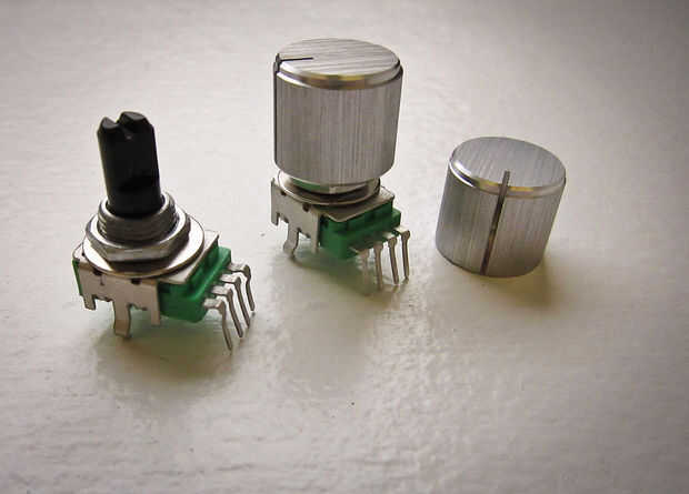 (Buscar ' PEC11-' en Newark para obtener una larga lista de codificadores agradables y asequibles. Usé PEC11-4115F-S0018 y PEC11-4215F-S0024 en mi build. Había probado muchos codificadores y el Bourns unos a ser mejor. Tienen D y eje moleteado opciones disponibles).