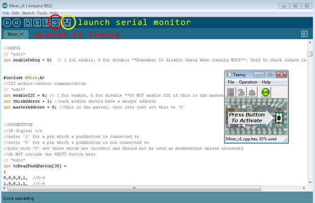 Aunque el cargador Teensy le dice 'Pulse botón a activar' puede subir el código directamente a la Teensy usando el botón 'Subir' en el entorno de Arduino (ver imagen). Esto es importante porque una vez que el Teensy es seguro dentro de su controlador el botón de hardware no serán fácilmente accesible.