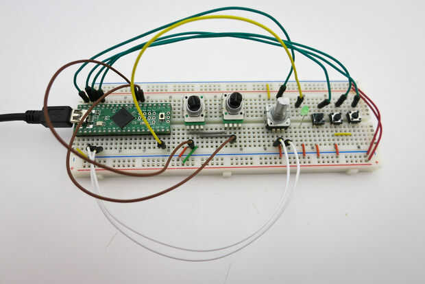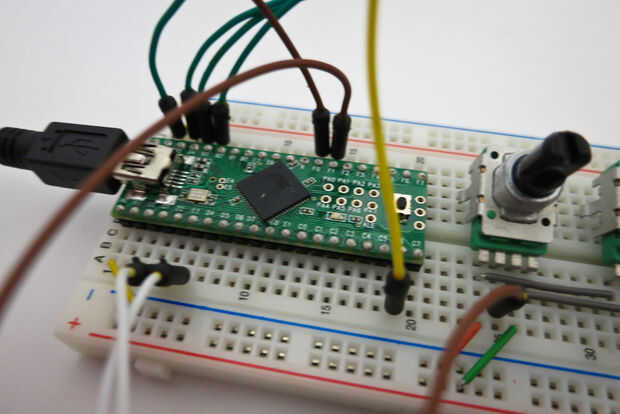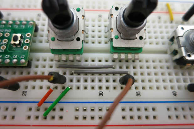También puede notar mis conexiones entre el aspecto de botones un poco goofy (un cable amarillo). Lo hice por una razón. Muestra que en vez de conectar el pulsador a tierra directamente a la tierra vinculada a la Teensy (franja azul) se puede conectar la tierra de un pulsador al siguiente, siempre y cuando uno de los pulsadores está ligada a la tierra Teensy. Esto es importante causa cuando va a cablear los componentes en el panel de la conexión a tierra en el Teensy generalmente no es tan conveniente como la tierra de los componentes vecinos. Esta es una excelente manera de reducir el número de alambres en los controladores. También hice lo mismo para los potenciómetros con los cables gris.