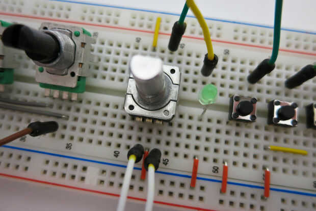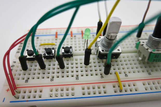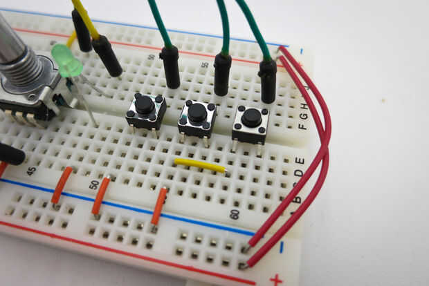 Conectar el circuito que vemos en las imágenes. Probablemente, sus pulsadores se verán muy diferentes a la mía, pero no te preocupes ya mismo - uno de los extremos a la tierra y el otro a una entrada digital conexión los pulsadores. Si tienes botones que no son respetuosos del protoboard solo soldadura algunos cables conexiones a ellos rápidamente.