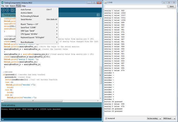 Sube el código a su Teensy ++ y lanzar al monitor serie. El serial monitor le dará retroalimentación como interactuar con los componentes: '24 pulsadas el botón', ' valor 2 analógicas: 344', ' codificador +'. Si el monitor serial es constantemente arrojando valores después de haber conectado algo incorrectamente. Asegúrese de que está ejecutando el monitor serial a 9600bps.