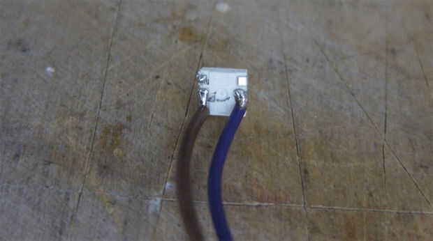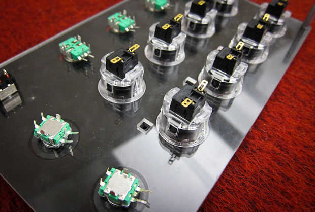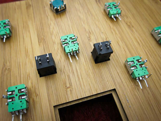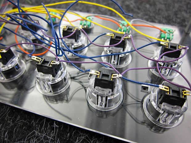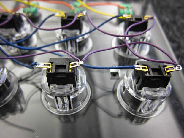 Los cables de pre-prensados compraste pueden cortarse por la mitad para hacer dos hilos. Los extremos cortados entonces pueden soldarse directamente a sus componentes y los extremos encrespados enchufados en las cubiertas de la encrespadura. Es útil si usted hace los cables lo suficientemente largos para que el panel superior puede conectar en la parte inferior PCB mientras que el panel superior queda en pie junto a él (ver imagen). Si va a crear un controlador de tamaño mediano/grande sería prudente comprar 24" conectados los cables, en lugar de 12". También es importante saber aproximadamente donde su PCB se colocará en el panel inferior por lo que puede cortar el cable a la longitud adecuada. Algunos componentes (como botones arcade) tienen alturas grandes y va a interferir con los componentes en el PCB. Note que en mi sampler tenía que colocar el PCB un poco fuera del centro en cuanto a no interferir en el Teensy ++ en mi PCB - quería mantener la altura tan baja como sea posible. Si se corta el cable demasiado largo puede pegarse al lado, así que tenga cuidado cuando corte - no se corta y no demasiado largo.
