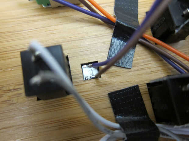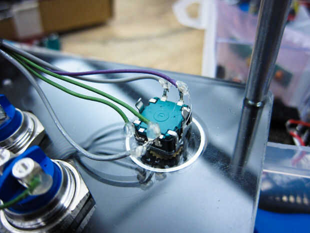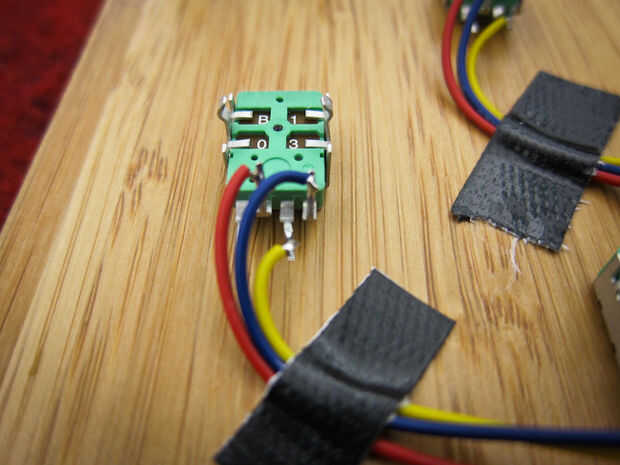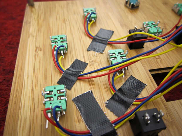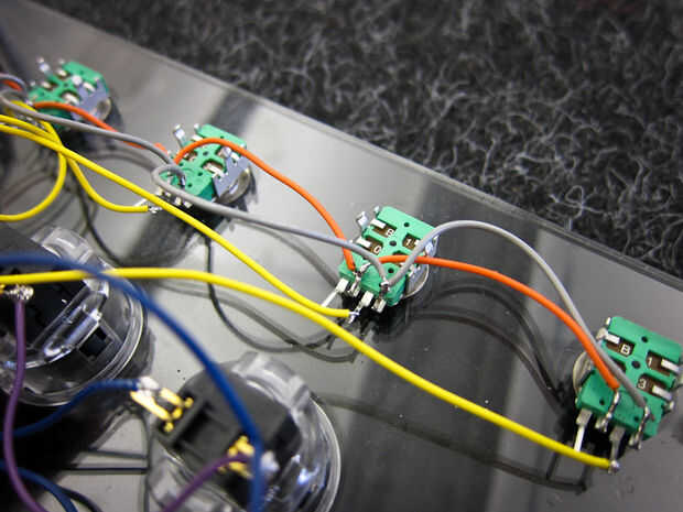 Capa del color no es imprescindible, pero útil si tienes suficientes cables. En el caso usted insensatas en su diseño y tiene una abundancia de cables, es útil comenzar a conectar las conexiones de tierra/de la energía entre los componentes (como se muestra en el paso 4). Sólo debe hacerlo si es necesario. En mi sampler tuve un lío de cables, tan conectado todas las conexiones a tierra de los botones de arcade entre sí (ver imágenes). De esta manera sólo tenía una conexión de tierra debe ser enchufado en la Junta. Hice lo mismo para la alimentación y la tierra de los potenciómetros (ver imágenes). Usted puede agregar cualquier cinta o pegamento de pistola (ver imágenes) a las conexiones soldadas. De esta manera cuando tire el cable, hay menos riesgo de ser separado del componente. Personalmente, encontré la cinta y pegamento ineficaz y terminó por eliminar dos de ellos después se convirtieron en una molestia.