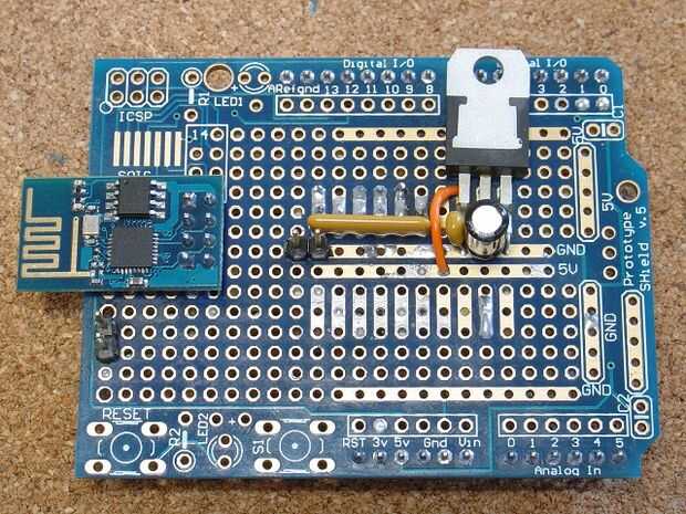 Los diodos 1N5819 protege la entrada de ESP8266-01 RX de salidas de 5V del micro procesador. La resistencia de 330 ohmios (R6) proporciona protección contra cortocircuitos en la salida ESP8266-01 TX, si D1 el micro-procesador accidentalmente se hace una salida. Es necesario algún tipo de fuente de 3V3. Pin de 3V3 de Arduino UNO no es lo suficientemente fuerte para suministrar el módulo de ESP2866. Aquí un tres terminales 5V a 3.3V regulador LD1117V33 se utiliza. El condensador de 10uF es necesario estabilizar el regulador LD1117V33, así está montado lo más cerca posible a la salida del regulador.