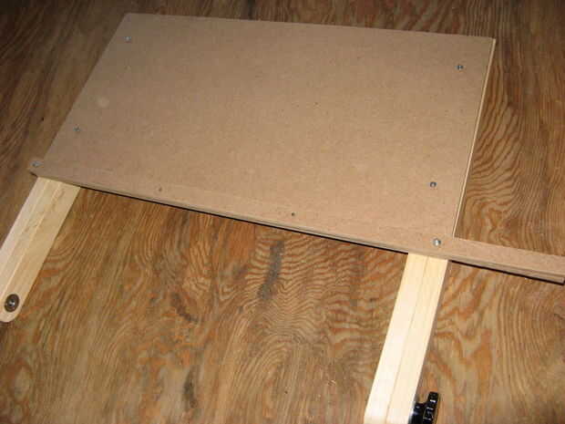 Cortar dos tiras de poco más de madera prensada, éstos servirán como el labio. Asegúrese de que están recto o derecho bastante, alinean en un extremo de la bandeja y clavo hacia abajo. Poner un tornillo en cada extremo del labio, ya que los clavos no parecen sostener muy bien. Utilice tornillos cortos para no meter a la parte inferior de la bandeja.