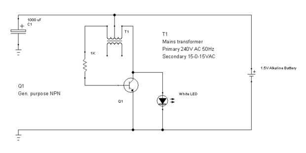 Las piezas son no críticos. Específicamente, el transformador de alimentación tiene una potencia de 15-0-15 voltios 250mA/c con 240 voltios CA primario que no se utiliza en esta etapa. Éste fue comprado nuevo de la cadena de Maplin en el Reino Unido pero hará casi cualquier pequeño transformador con un devanado secundario centro aprovechado y un elemento adecuado podría ser encontrado en el cuadro de basura o rescatado de viejos equipos. En algunos países como los Estados Unidos su transformador es probable tener 110VAC primario pero no creo que esto alterará grandemente el funcionamiento de este circuito. El transistor es un BC549 pero de nuevo, no crítico. El condensador electrolítico de 1000uF simplemente desacopla la línea de suministro.