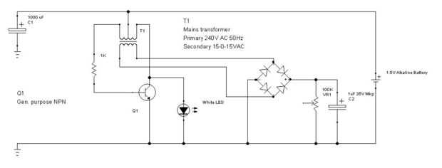 El circuito hasta el momento se puede probar conectar una batería y observando que un voltaje positivo se construye para arriba a través del potenciómetro y el condensador electrolítico. En este caso una pila de voltios 0,52 rindió alrededor de 5 voltios y una pila de voltios 1.3 rindió 19 voltios. Estas mediciones responden una consulta que algunos pueden tienen que esperar seguramente altos voltajes a través de lo que es la entrada de alto voltaje del transformador. En la práctica esto no es un problema. Los picos transitorios de voltaje podrían cargar un condensador de alto voltaje pequeño hasta 50 o 60 voltios pero aquí la carga de 100kOhm pequeño potenciómetro puede caer la tensión a niveles poco seguros. Más no podemos extraemos cualquier energía utilizable de esta parte del circuito, es para control solamente.