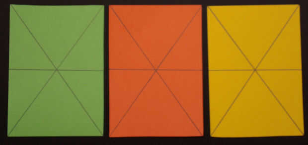Dibujar en cada rectángulo dos diagonales y una línea paralela al lado menor del rectángulo que se divide en dos lados más largos del rectángulo. Estas líneas marcan donde cuatro de los rectángulos se cortará en pequeñas figuras geométricas y donde se cortarán las rajas en los rectángulos. (Sólo la mitad de los rectángulos de colores con líneas dibujadas en ellos se muestran en la foto de arriba).